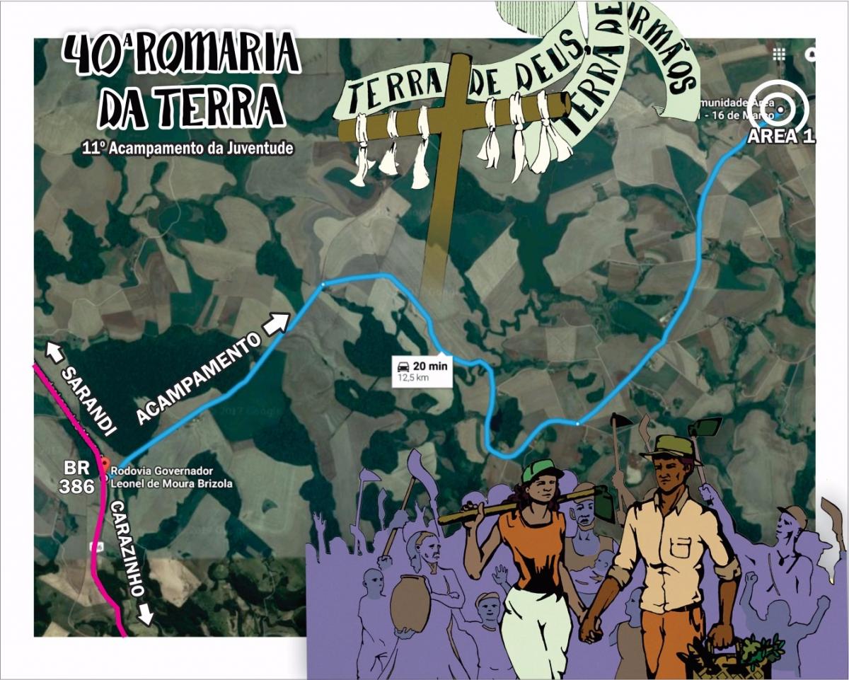 Localização: O acampamento não será no mesmo local que a Romaria. A comunidade que nos acolherá é parte do assentamento, área 01. Um ponto de referência é o Camping Zambiasi. Mapas em anexo.
