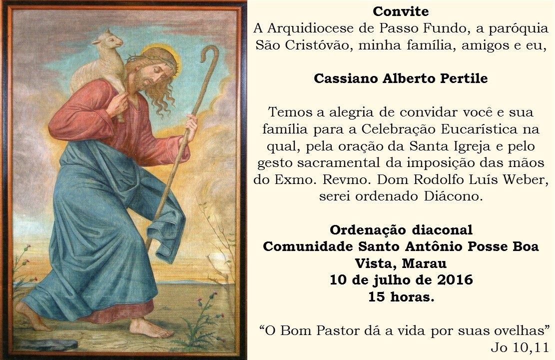 O jovem, filho de Carlos e Lourdes Rissardo Pertile, é natural de Marau, onde nasceu no dia 24 de janeiro de 1990. O lema escolhido por Cassiano o ajuda a viver com clareza o chamado de Deus na sua vocação: “O Bom Pastor dá a vida por suas ovelhas”, Jo 10, 11.