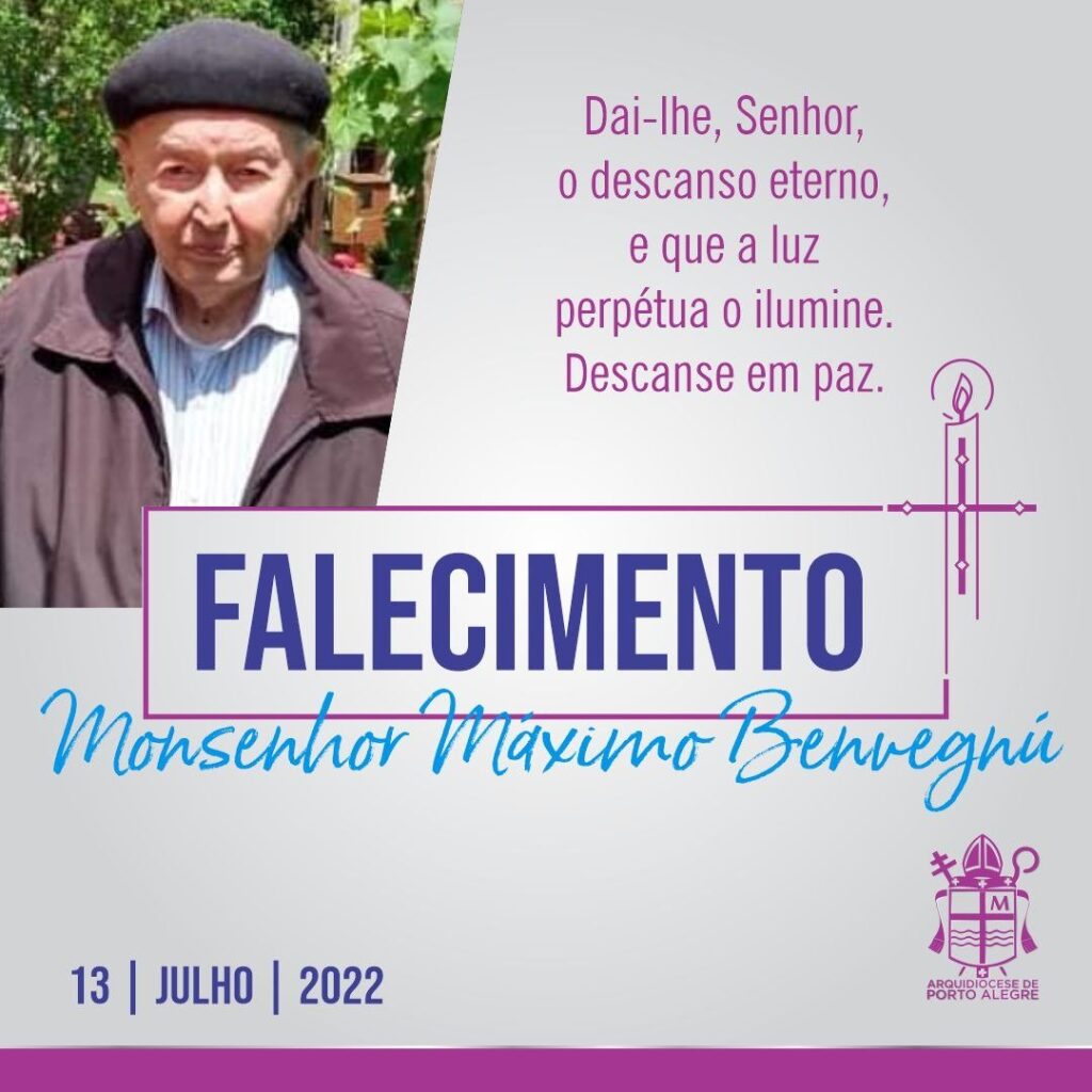 A Arquidiocese de Passo Fundo, com muito pesar, comunica o falecimento do Monsenhor Máximo Inácio Benvegnú ocorrido nesta quarta-feira, dia 13 de julho, aos 96 anos. Ele faleceu por volta das 8h15min no Hospital Santa Lucia, em Casca. A partir de fevereiro de 2011 passou a residir em São Domingos do Sul, junto aos familiares.