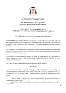 A Arquidiocese de Passo Fundo tornou público, nesta quarta-feira (19), o decreto que institui oficialmente os locais de peregrinação do Ano Jubilar de São Francisco de Assis, a ser celebrado de 10 de janeiro de 2026 a 10 de janeiro de 2027.