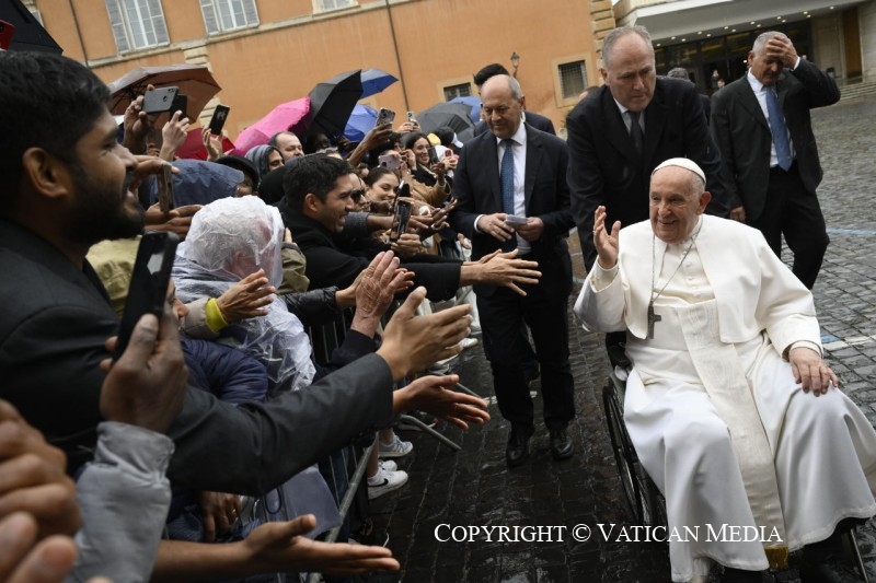 Mas no caminho que todos percorremos rumo à plenitude da vida, que pertence ao destino de cada pessoa – o destino de cada pessoa é a plenitude, ser cheia de vida – o cristão goza de uma ajuda especial do Espírito Santo, o Espírito de Jesus. Ela é implementada com o dom de outras três virtudes, distintamente cristãs, que nos escritos do Novo Testamento são frequentemente mencionadas juntas. Estas atitudes fundamentais, que distinguem a vida do cristão, são três virtudes que agora diremos juntos: fé, esperança e caridade. Digamo-las juntos: [juntos] Fé, esperança… não ouço nada, mais alto! [juntos] Fé, esperança e caridade. Muito bem! Os escritores cristãos chamaram-lhes depressa virtudes “teologais”, dado que são recebidas e vividas na relação com Deus, para as diferenciar das outras quatro virtudes chamadas “cardeais”, uma vez que constituem a “charneira” de uma vida boa. Estas três são recebidas no Batismo e derivam do Espírito Santo. Todas, tanto as teologais como as cardeais, confrontadas em muitas reflexões sistemáticas, compuseram assim um maravilhoso septenário, que muitas vezes é oposto ao elenco dos sete vícios capitais. É assim que o Catecismo da Igreja Católica define a ação das virtudes teologais: «Fundamentam, animam e caraterizam o agir moral do cristão. Informam e vivificam todas as virtudes morais. São infundidas por Deus na alma dos fiéis para os tornar capazes de proceder como filhos seus e assim merecerem a vida eterna. São o penhor da presença e da ação do Espírito Santo nas faculdades do ser humano» (n. 1813).