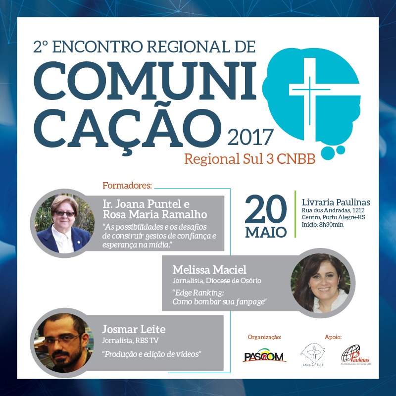 A programação, que inicia às 8h30, acontecerá na Livraria Paulinas, em Porto Alegre, seguirá o tema do Dia Mundial das Comunicações e, através da fala da irmã Joana Puntel – jornalista, mestra e doutora em Ciências da Comunicação -, vai buscar refletir sobre as possibilidades e os desafios de construir gestos de confiança e esperança na mídia. Durante a tarde, serão realizadas duas oficinas voltadas para compreender os processos de mídia no contexto atual da comunicação. A primeira, “Edge Ranking: Como bombar sua fanpage”, será ministrada pela jornalista da Diocese de Osório, Melissa Maciel e a segunda, “Produção e edição de vídeos”, será abordada pelo jornalista da RBS TV, Josmar Leite.