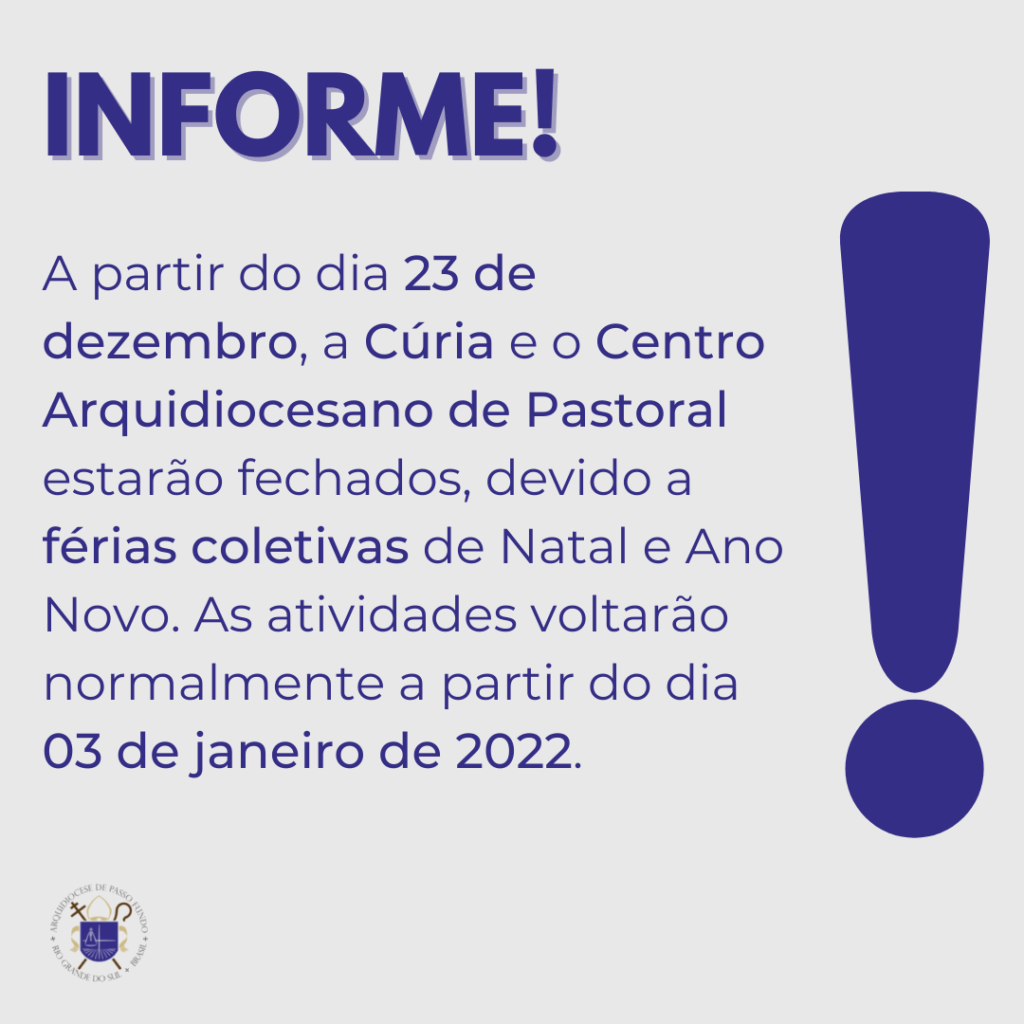 A partir de amanhã, dia 23 de dezembro, a Cúria e o Centro Arquidiocesano de Pastoral estarão fechados, devido a férias coletivas de Natal e Ano Novo. As atividades voltarão normalmente a partir do dia 03 de janeiro de 2022.