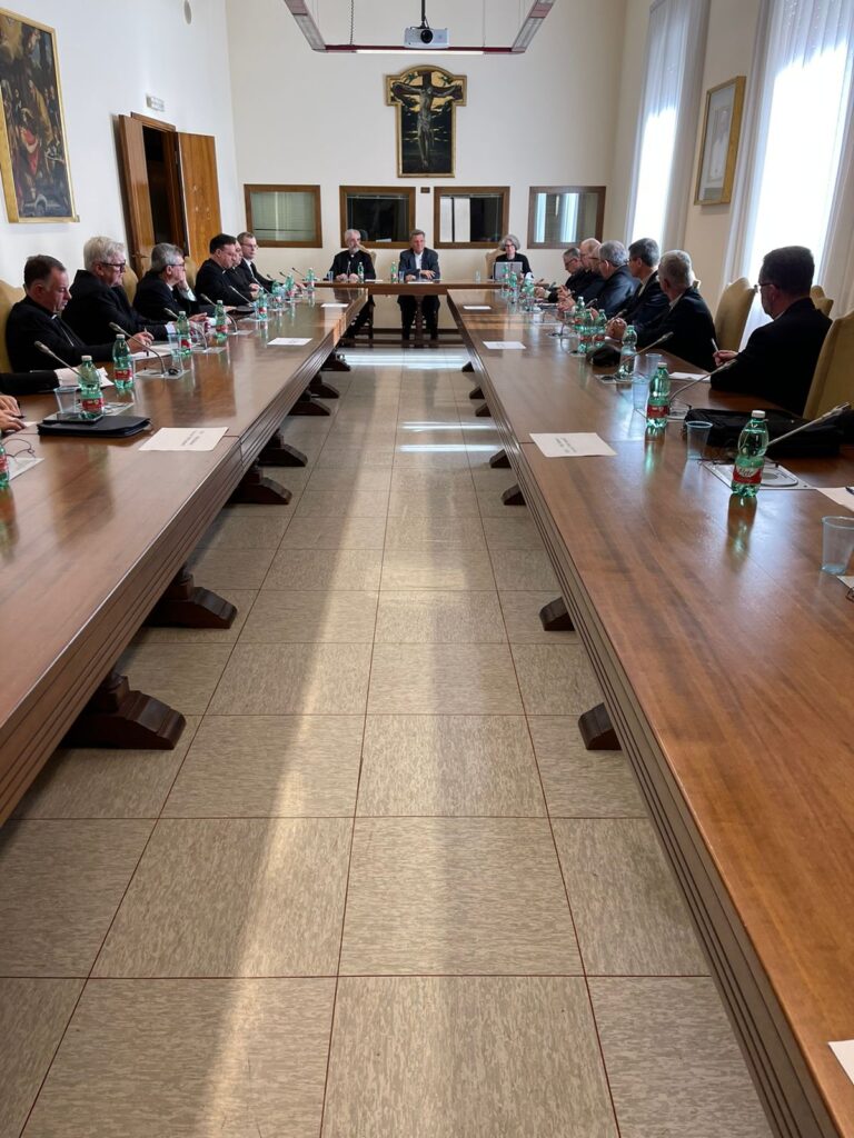 O último encontro do primeiro dia da visita Ad Limina, aconteceu na Secretária Geral do Sínodo dos Bispos, com o Cardeal Mario Grech. Nesta reunião, coube a Dom Rodolfo Luís Weber saudar o Cardeal em nome dos Bispos do Regional Sul 3: “Fiz referências há alguns elementos do Documento Preparatório para este Sínodo e também manifestamos nosso desejo de compreender tudo aquilo que a Secretaria Geral do Sínodo está nos colocando.