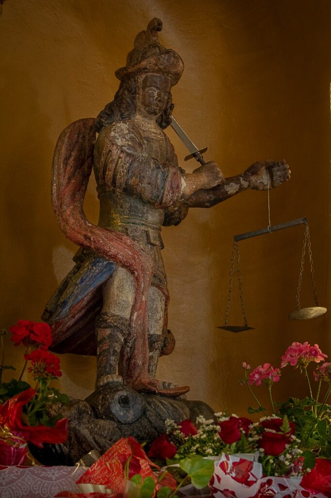 No caminho encontraram algo considerado de grande valor que os acompanhou na viagem de retorno: “nas imediações das ruínas do povoado jesuítico de São Miguel, encontraram, à beira de uma lagoa uma estátua, representando o arcanjo do mesmo nome, São Miguel, achado que resolveram trazer consigo”. A imagem encontrada pelo Generoso e seu filho é talhada de cedro e representa um arcanjo com vestes de general, uma espada em uma das mãos e a balança em outra. O arcanjo faz uso de sandálias, está sobre uma criatura semelhante a um dragão, possui longos cabelos e é de fisionomia jovem.