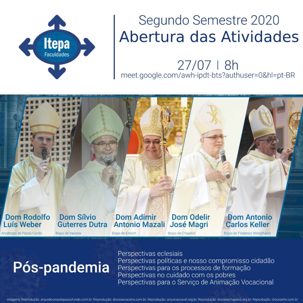 Perspectivas eclesiais, políticas e de cuidado com os pobres serão alguns dos temas abordados durante um encontro, promovido pela Itepa Faculdades, na segunda-feira, 27, para dar início ao segundo semestre do ano na instituição. A atividade, que acontecerá de forma online, através do Google Meet, poderá ser acompanhada pela comunidade e envolverá o arcebispo de Passo Fundo, Dom Rodolfo Luís Weber, o bispo de Vacaria, Dom Silvio Guterres Dutra, o bispo de Erexim, Dom Adimir Antonio Mazali, o bispo de Chapecó, Dom Odelir José Magri e, também, o bispo de Frederico Westphalen, Dom Antonio Carlos Keller.