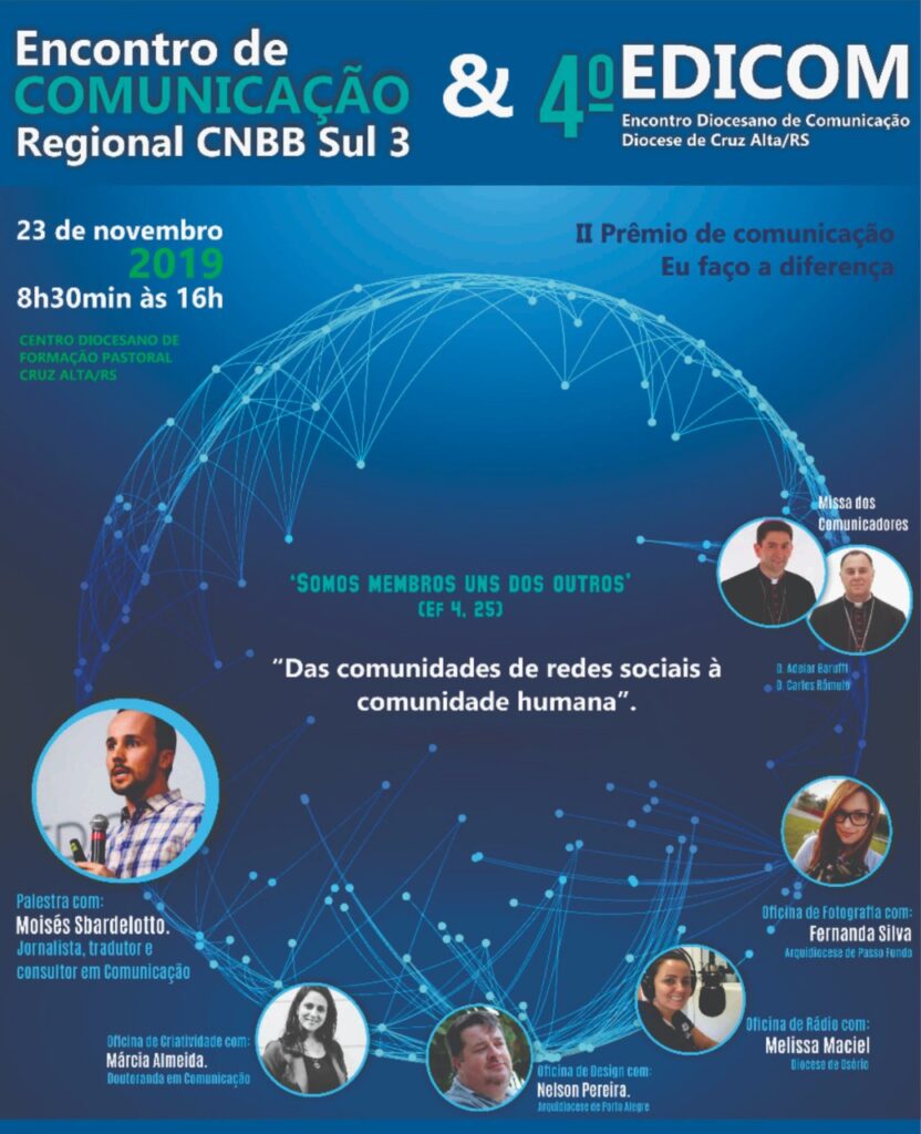 IV Encontro de Comunicação do Regional Sul 3 – CNBB, que neste ano acontece juntamente ao IV EDICOM – Encontro Diocesano de Comunicação da Diocese de Cruz Alta, acontece neste sábado, 23, no Centro Diocesano de Formação Pastoral de Cruz Alta/RS. O evento, que tem como tema, “Somos membros uns dos outros” (Ef 4, 25): das comunidades de redes sociais à comunidade humana” vai fazer  referência à mensagem do Papa Francisco pelo Dia Mundial das Comunicações Sociais de 2019 e é destinado a todos os agentes da Pastoral da Comunicação – PASCOM do Rio Grande do Sul, bem como agentes e lideranças que atuam na comunicação das pastorais e movimentos nas paróquias e Arqui/Dioceses.