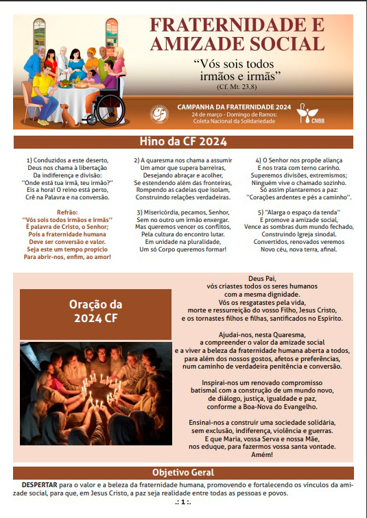 Está disponível para download o Folhetão da Campanha da Fraternidade 2024, produzido pela Equipe Arquidiocesana para a Campanha da Fraternidade, ele tras como objetivo DESPERTAR para o valor e a beleza da fraternidade humana, promovendo e fortalecendo os vínculos da amizade social, para que, em Jesus Cristo, a paz seja realidade entre todas as pessoas e […]