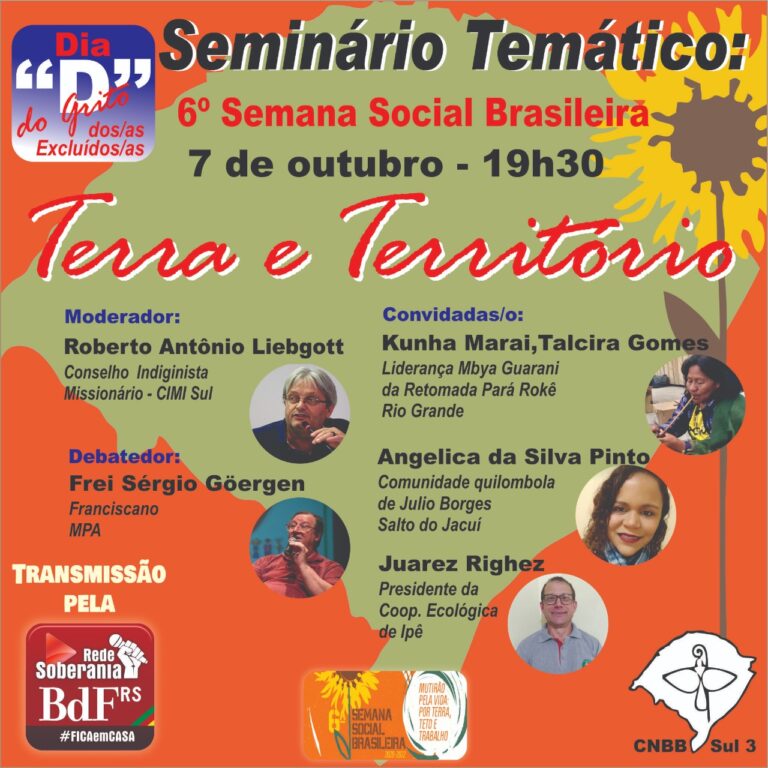 A Comissão Episcopal Pastoral para a Ação Sociotransformadora da CNBB Sul 3 e parceiros vão realizar nos meses de outubro, novembro e dezembro, três eventos “ao vivo”, sempre no dia 7 de cada mês às 19:30, pelas Redes Sociais da Rede Soberania e CNBB Sul 3. Estas atividades integram o processo de mobilização e reflexão temática da 6ª […]