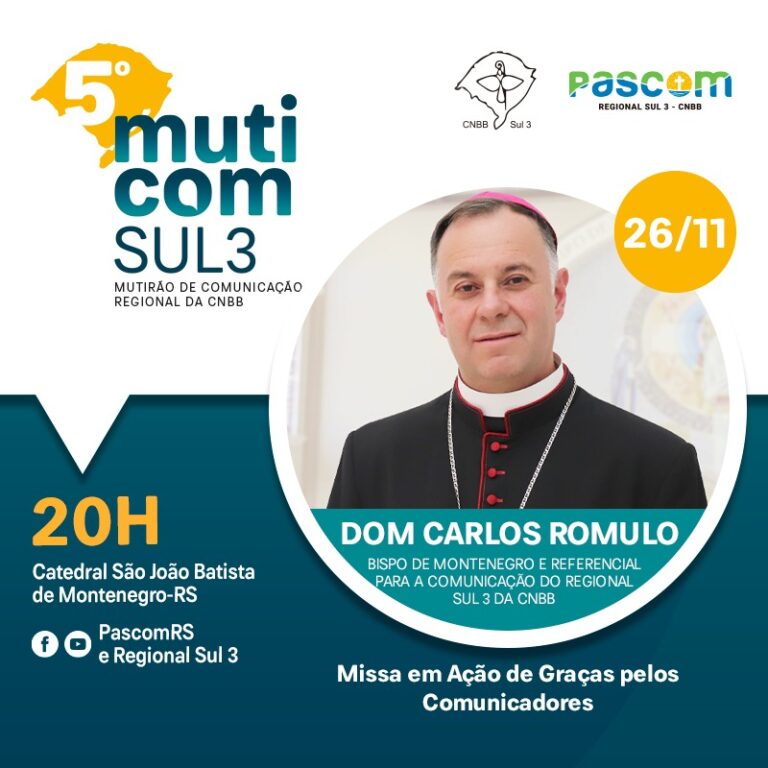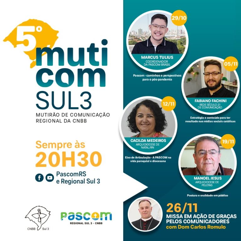 O 5º Mutirão de Comunicação do Regional Sul 3 inicia nesta quinta-feira, com a live Pascom – caminhos e perspectivas para o pós-pandemia. O encontro, que será mediado pela coordenadora da Pastoral da Comunicação no Estado, Greice Pozzatto, contará com a participação de Marcus Tullius, Coordenador da Pascom Brasil. A proposta deste 5º Muticom vem ao encontro da […]