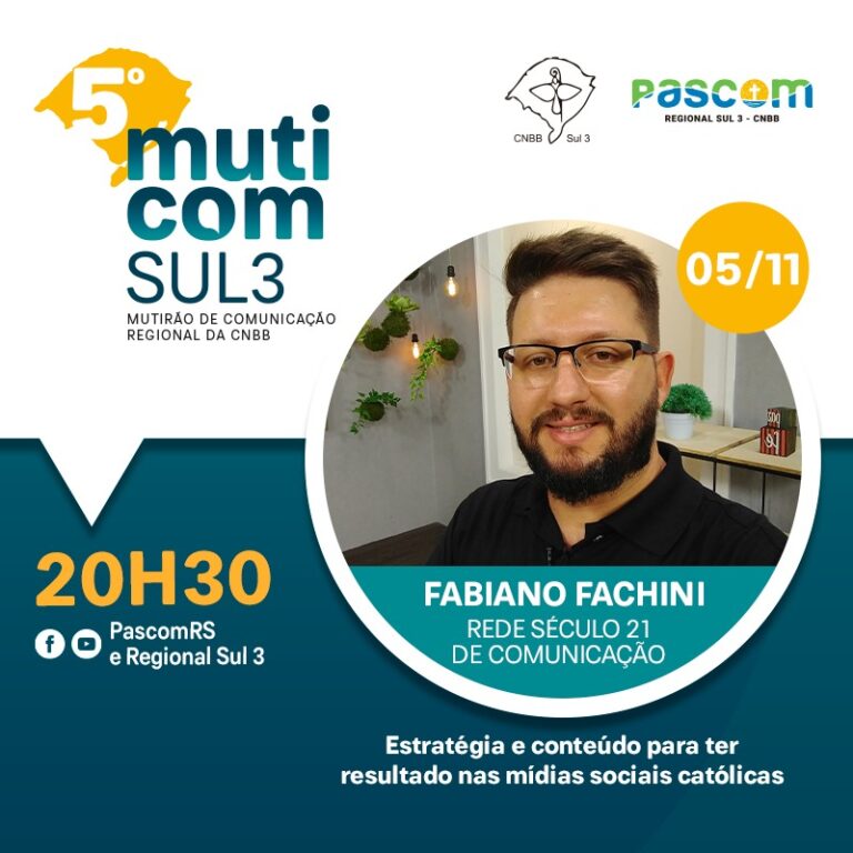 O 5º Mutirão da Comunicação do Regional Sul 3 continua nesta quinta-feira, 05 de novembro. A segunda live do Muticom é às 20h30min e refletirá o tema Estratégia e conteúdo para ter resultado nas mídias sociais católicas, com a participação de Fabiano Fachini. Fabiano tem mais de 10 anos de experiência em Comunicação nas áreas de Assessoria de Imprensa, Jornalismo Impresso, TV, Rádio, […]