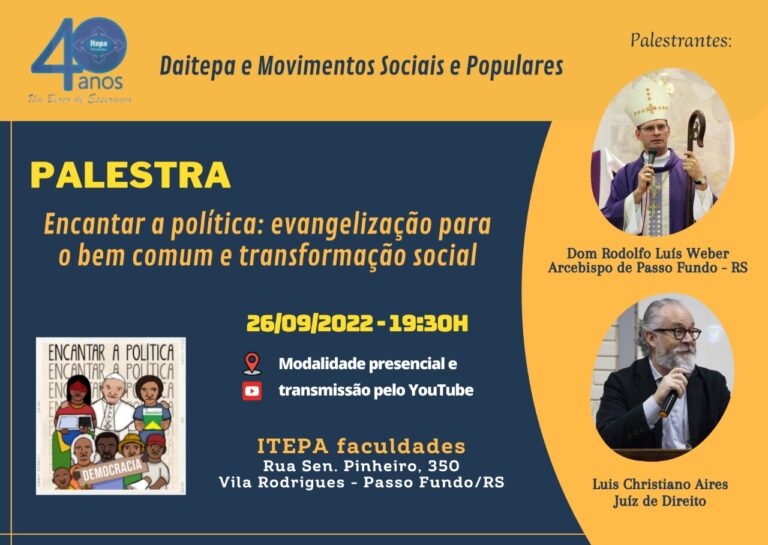O Diretório Acadêmico da Faculdade de Teologia da Itepa Faculdades, através do Setor Movimentos Sociais e Populares, está promovendo uma palestra com a temática “Encantar a política: evangelização para o bem comum e transformação Social”. Segundo a acadêmica Mari Maule, “na grande festa da democracia, a nossa proposta é o Reino de Deus […]