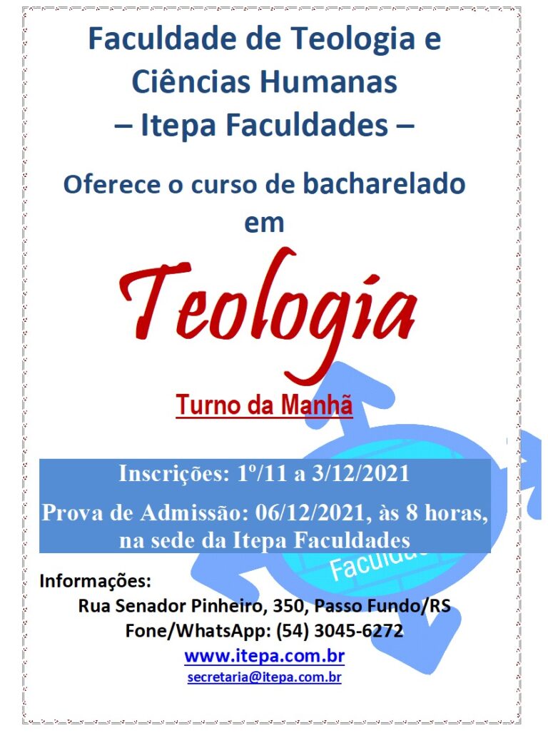Estão abertas as inscrições para a Prova de Admissão para o Curso de Bacharelado em Teologia da Faculdade de Teologia e Ciências Humanas (Itepa Faculdades), a prova será realizada no dia 06 de dezembro de 2021, das 08h às 11hs e serão disponibilizadas 25 vagas para a turma de 2022. As inscrições para o […]