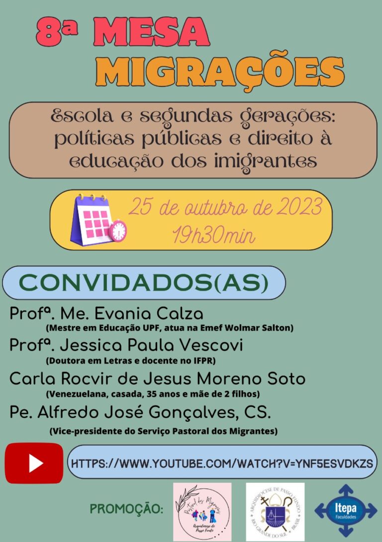 A 8ª Mesa Migrações tem por tema “Escola e segundas gerações: políticas públicas e direito à educação dos imigrantes”. O evento acontecerá dia 25 de outubro, às 19h30min, em formato on-line. Escreveu o Papa Francisco: “compreendo que alguns tenham dúvidas e sintam medo à vista das pessoas migrantes; compreendo-o como um aspecto do instinto natural de autodefesa. […]