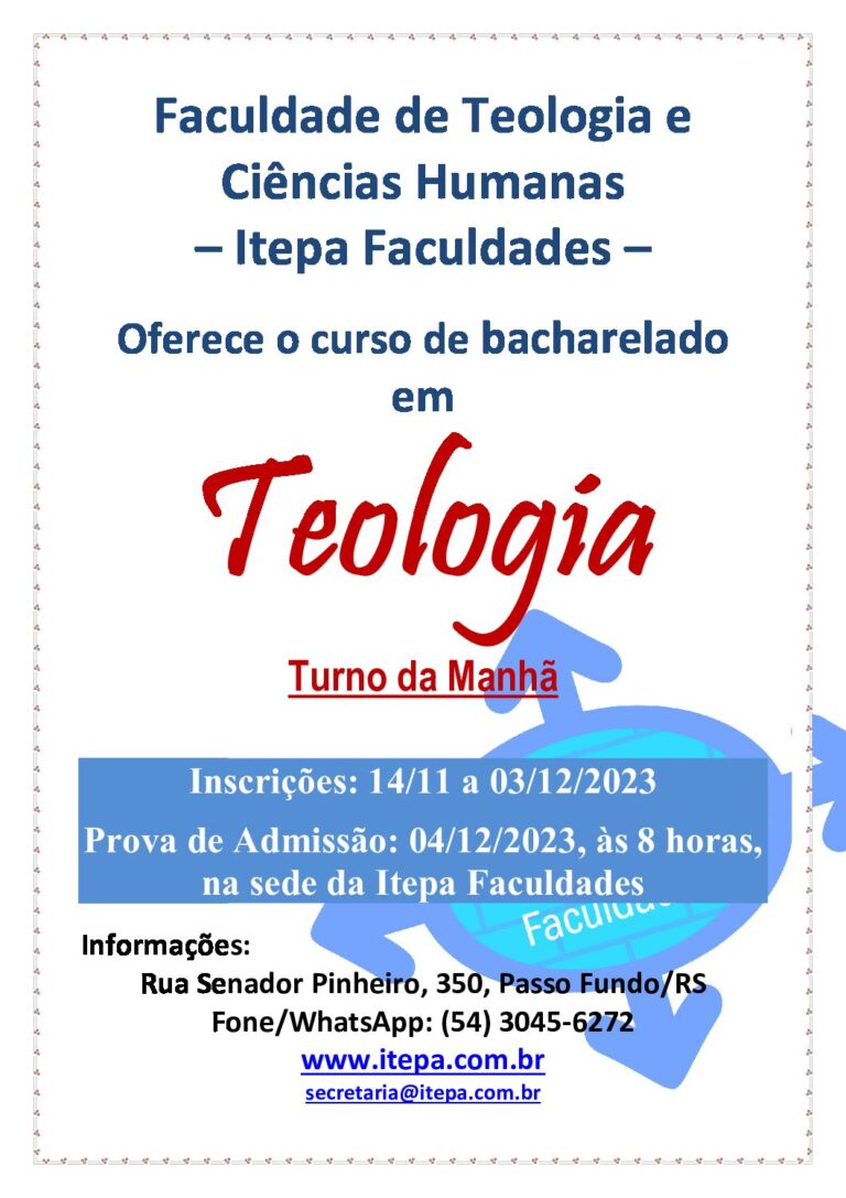 O Diretor da Faculdade de Teologia e Ciências Humanas – Itepa Faculdades – torna público que no dia 04 de dezembro de 2023, das 8 às11hs, a IES realizará a Prova de Admissão para o Curso de Bacharelado em Teologia, reconhecido pela Secretaria de Educação Superior na Portaria nº 213, de 17/5/2013 e renovado o […]