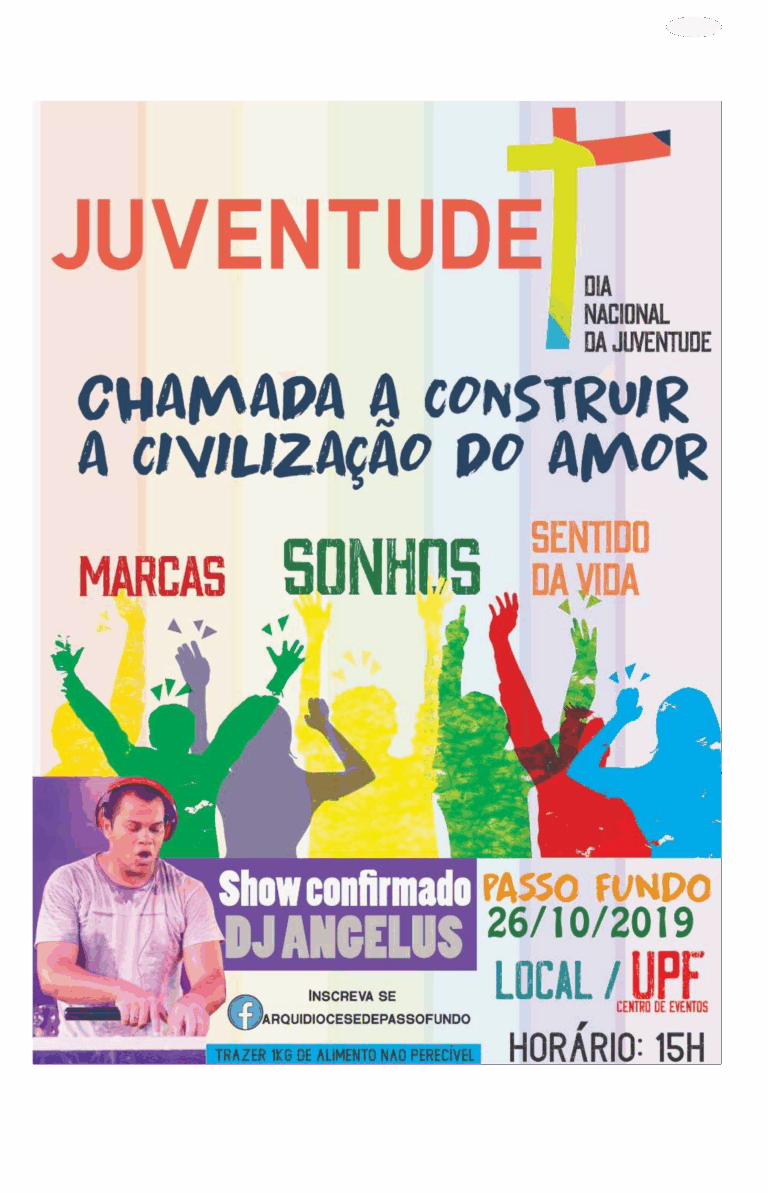 “Juventude chamada a construir a Civilização do Amor” é o tema que será celebrado na Arquidiocese de Passo Fundo no Dia Nacional da Juventude. Preparado desde março pelo Setor Juventude, o DNJ acontece neste sábado, 26, no Centro de Eventos da Universidade de Passo Fundo, e vai reunir cerca de 400 jovens dos movimentos, pastorais e […]