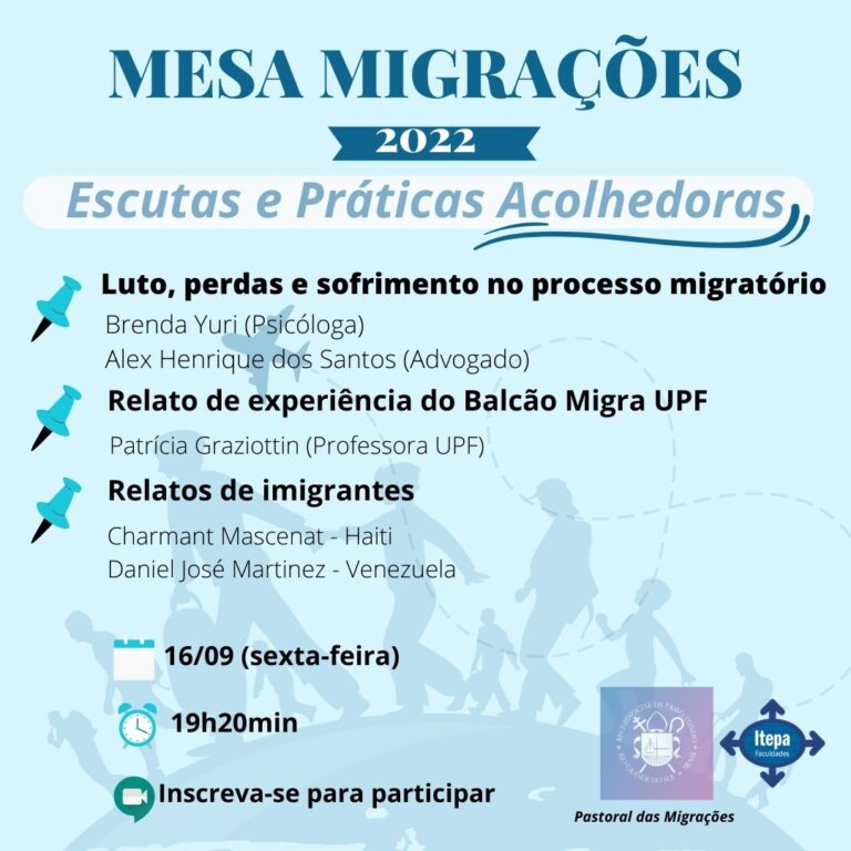 A Pastoral das Migrações convida a comunidade a participar da atividade Mesa Migrações 2022 – Escutas e práticas acolhedoras, que irá acontecer nesta sexta-feira, 16 de setembro, de forma online. O encontro acontece de forma online, às 19h20min, gratuitamente. Quem desejar certificação, basta acessar o link CLICANDO AQUI e realizar a inscrição, quem preferir apenas […]