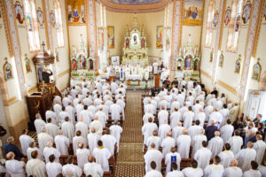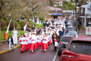 Às 9h, integrantes da comissão da fase diocesana do processo de beatificação de Monsenhor João Benvegnú apresentaram aspectos da vida, história e aprofundamento teológico do Servo de Deus. Logo após, os presbíteros, acompanhados pelos coroinhas da paróquia, seguiram em procissão até a Igreja Matriz, em clima de oração e canto.