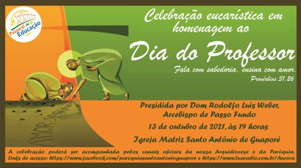 Como marco deste momento de reestruturação, a pastoral da educação está organizando uma Celebração Eucarística em homenagem ao Dia do professor. Ela irá acontecer no próximo dia 13 de outubro, na Igreja Santo Antônio, de Guaporé e será presidida por Dom Rodolfo Luis Weber. Contará também com a presença dos padres da Área Pastoral,  da Coordenação Arquidiocesana de Pastoral, de lideranças pastorais e de representantes de Escolas de Guaporé, Serafina Correa, Dois Lajeados, União da Serra e de Casca.  Uma equipe da pastoral da educação está envolvida nesta preparação que será transmitida pela Rádio Aurora, pelos meios virtuais da Paróquia Santo Antônio e da Arquidiocese, além de outros canais de comunicação.