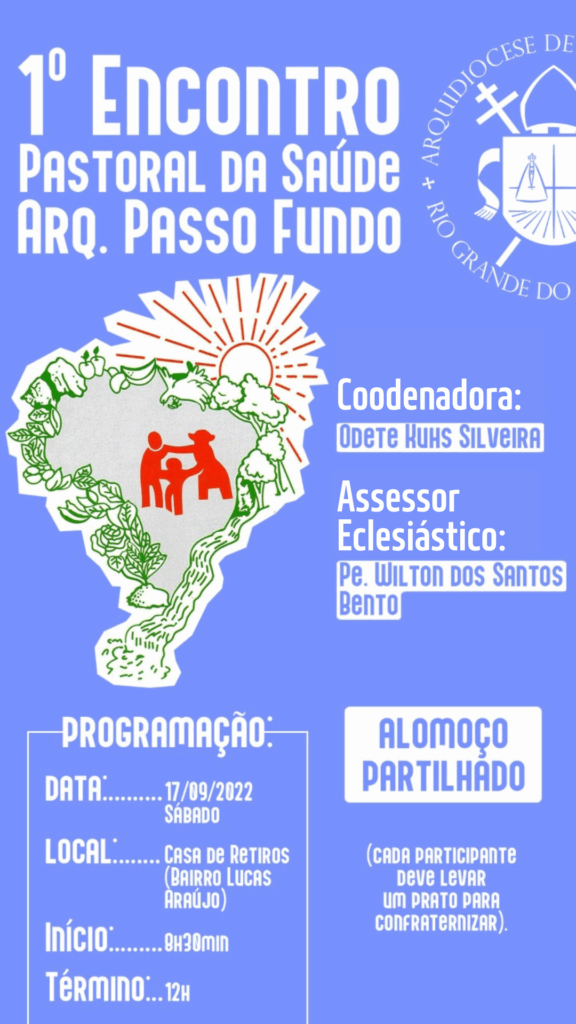Neste sábado, dia 17 de setembro, a Pastoral da Saúde irá realizar um Encontro Arquidiocesano para os agentes paroquiais, na Casa de Retiros, em Passo Fundo. O encontro terá início às 08h30min, e se encerra às 12h, com almoço partilhado.