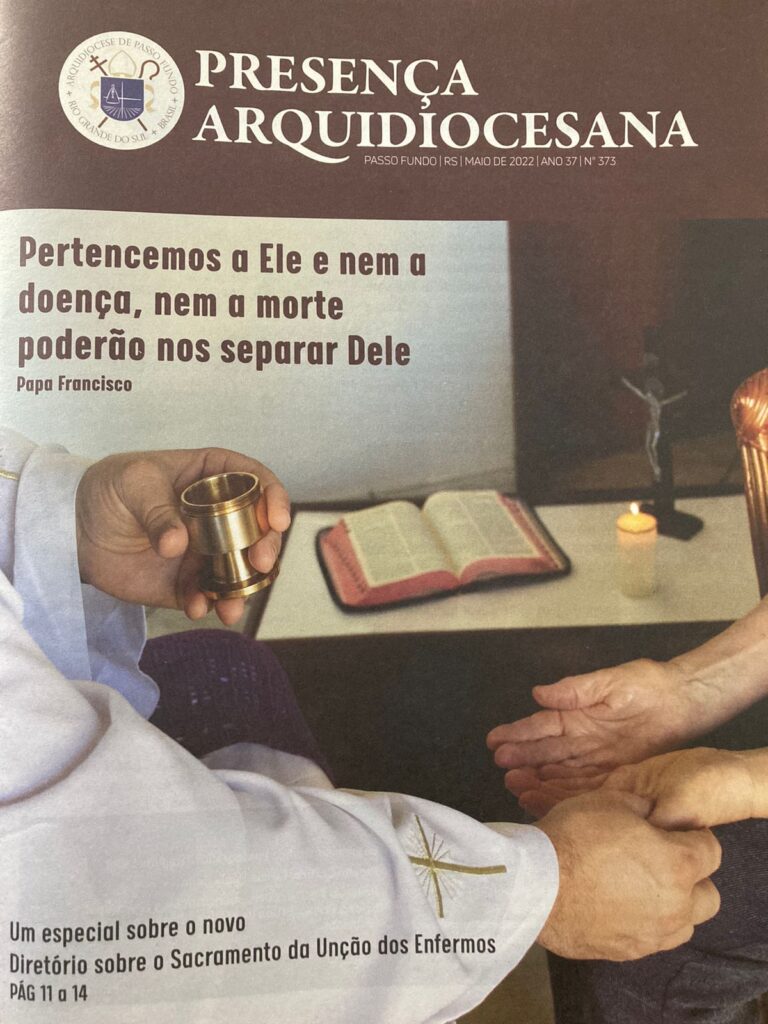 Já está circulando em toda a Arquidiocese de Passo Fundo a edição de maio do informativo oficial Presença Arquidiocesana, que conta uma Edição Especial focada no Sacramento da Unção dos Enfermos, que terá seu Diretório lançado no dia 26 de junho em toda a Arquidiocese. A matéria explica sobre os princípios da Unção dos Enfermos, como o Sacramento deve ser realizado, quais são os momentos corretos para solicitá-lo e muito mais.