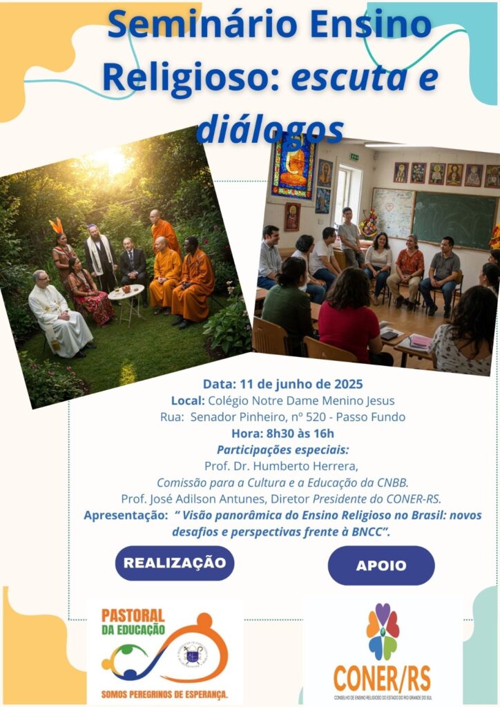 Na Quarta-feira, 11 de junho, a Escola Menino Jesus, em Passo Fundo, acolheu o Seminário “Ensino Religioso: estudos e diálogos”, promovido pela Pastoral da Educação da Arquidiocese de Passo Fundo, com o apoio do Conselho de Ensino Religioso – Seccional de Passo Fundo (CONER). O evento foi marcado por momentos de formação, partilha e vivência ecumênica, reunindo educadores, lideranças religiosas e agentes pastorais em um espaço de diálogo e escuta mútua.