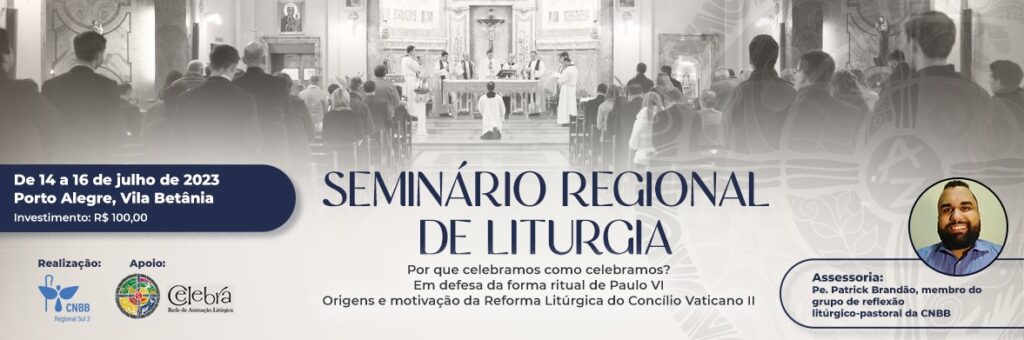 O Seminário Regional de Liturgia já tem data marcada: de 14 a 16 de julho, em Porto Alegre. Este ano, a proposta do encontro é refletir o tema “Por que celebramos como celebramos? Em defesa da forma ritual de Paulo VI: Origens e motivação da Reforma Litúrgica do Concílio Vaticano II”. O encontro contará com a assessoria do Pe. Patrick Brandão, membro do grupo de reflexão litúrgico-pastoral da CNBB.
