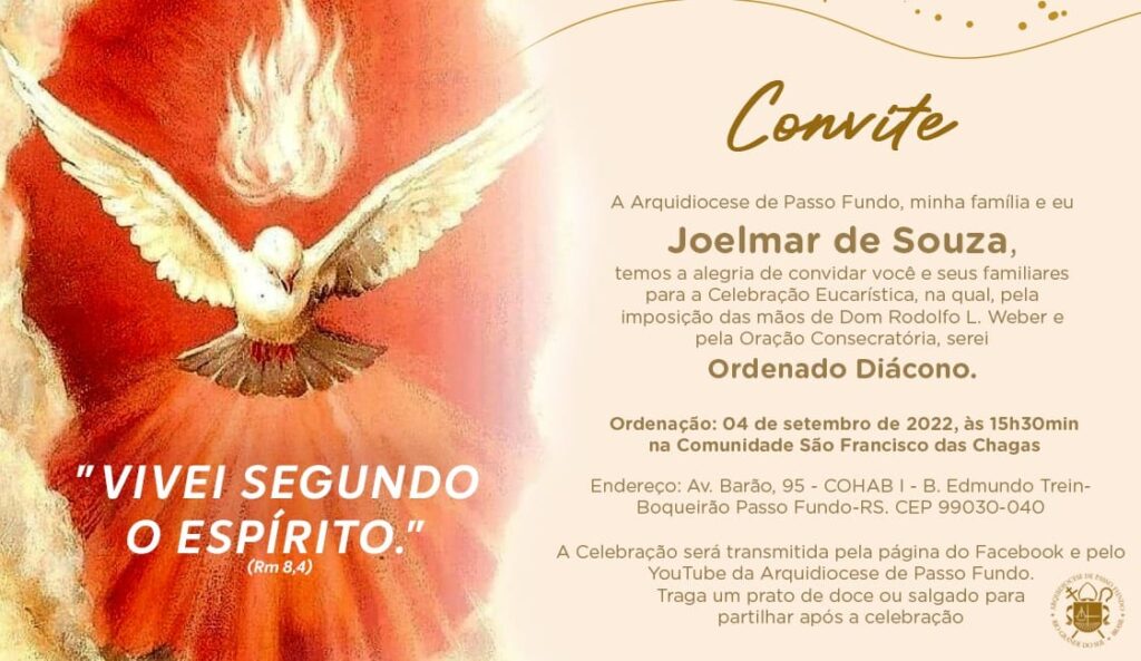Com o lema “Vivei segundo o Espírito”, tirado da Carta de Romanos, a Arquidiocese de Passo Fundo acolhe a Ordenação Diaconal do seminarista Joelmar de Souza, neste domingo, dia 04 de setembro, às 15h30min, na comunidade São Francisco das Chagas, da paróquia São Vicente de Paulo, em Passo Fundo.